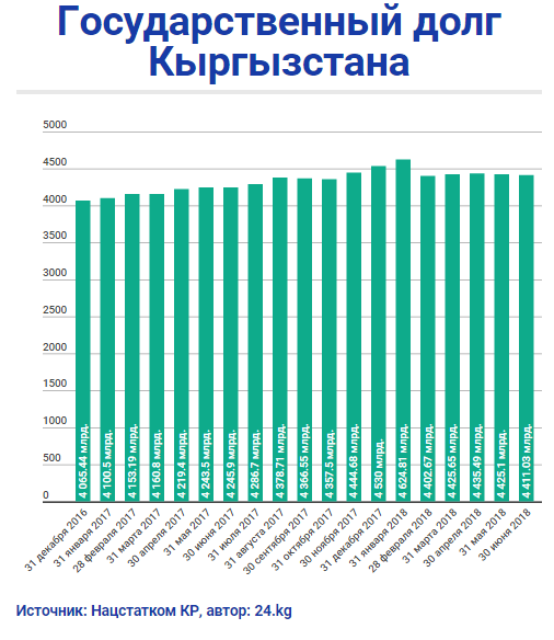 По данным Министерства финансов, на 30 июня 2018 года объем государственного долга (внешний + внутренний) составил $4 миллиарда 411,03 миллиона (300 миллиардов 744,06 миллиона сомов). В том числе внешний долг сложился в сумме $3 миллиарда 809,19 миллиона (259 миллиардов 710,58 миллиона сомов), внутренний — $585,33 миллиона (41 миллиард 33,49 миллиона сомов).