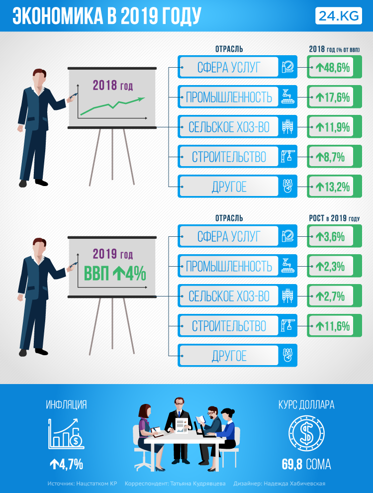 В 2019 году объем ВВП на душу населения составит $1 тысячу 399,8. Среднемесячная заработная плата — 17 тысяч 440,7 сома, а прожиточный минимум — 5 тысяч 219,2 сома.