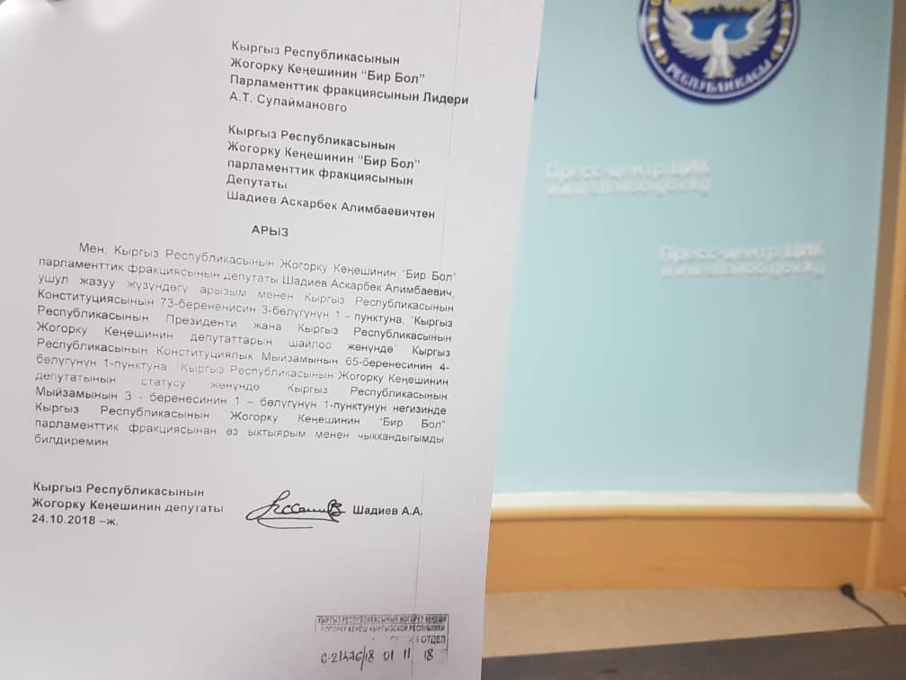 The Central Election Commission of Kyrgyzstan claims that they have deprived Askarbek Shadiev of his deputy seat on the basis of a decision of Bir Bol faction. Deputy Chairman of the Central Election Commission Abdyzhapar Bekmatov stated.