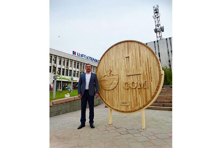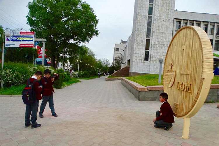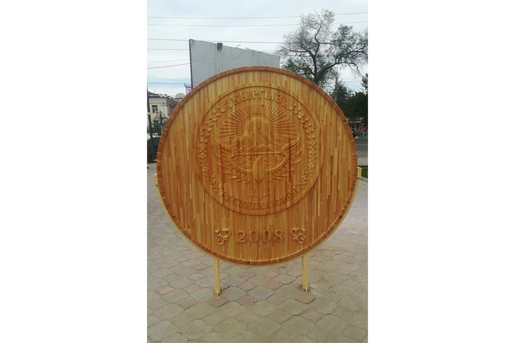 A wooden installation of 1 som coin appeared in Bishkek. Deputy of the Parliament Zhyrgalbek Turuskulov presented it on the 141st anniversary of the capital. He posted on Facebook.