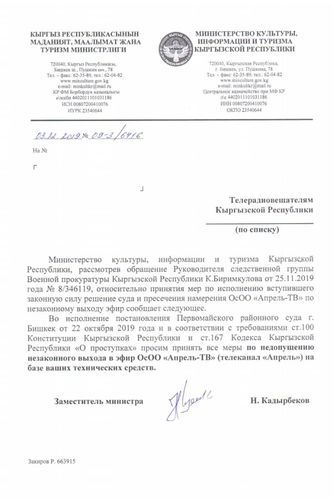 The Ministry of Culture of Kyrgyzstan banned all television operators from broadcasting Aprel TV channel. The corresponding letter was sent by the Deputy Minister of Culture, Information and Tourism Nurzhigit Kadyrbekov. Website of the channel reports.
