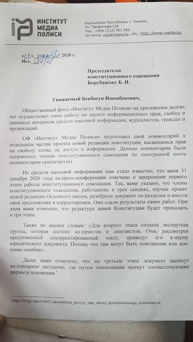 «Unfortunately, amendments to the draft Constitution were not published. We believe that such drafts should be available to the public for making suggestions and comments. Kyrgyzstanis do not know now which provisions of the draft Constitution have been changed. It is not clear where you can get acquainted with it and study it,» the appeal says.