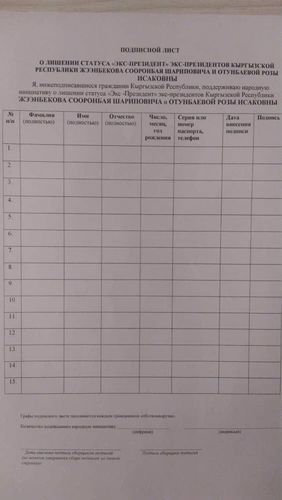 Collection of signatures has begun in Kyrgyzstan for depriving Roza Otunbayeva and Sooronbai Jeenbekov of the status of ex-president. Blogger Chingiz Kaparov is the initiator.