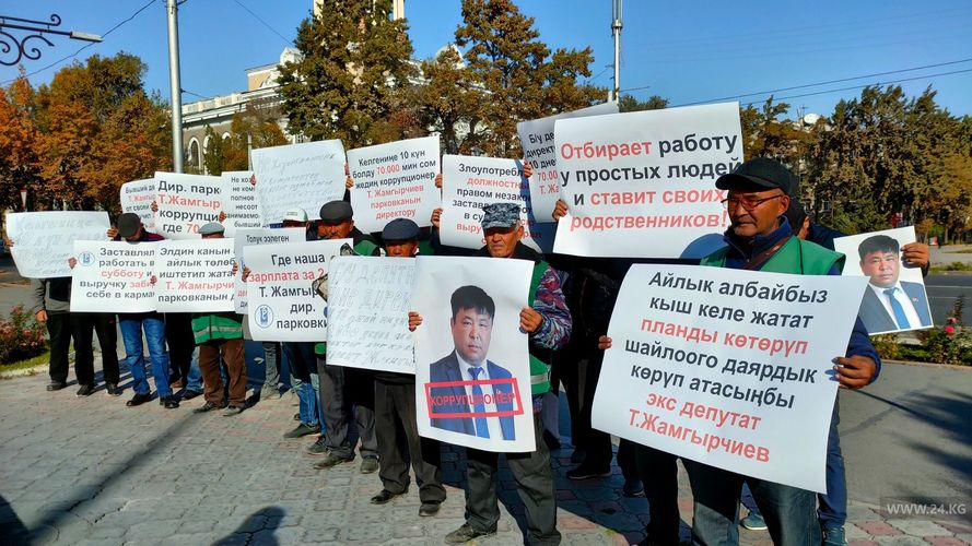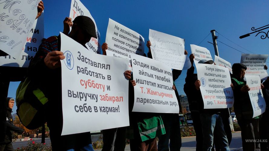 About 20 people demand resignation of the director of the municipal enterprise Talantbek Zhamgyrchiev. The protesters claim that he forced the parking attendants to work on weekends, and took away the proceeds.