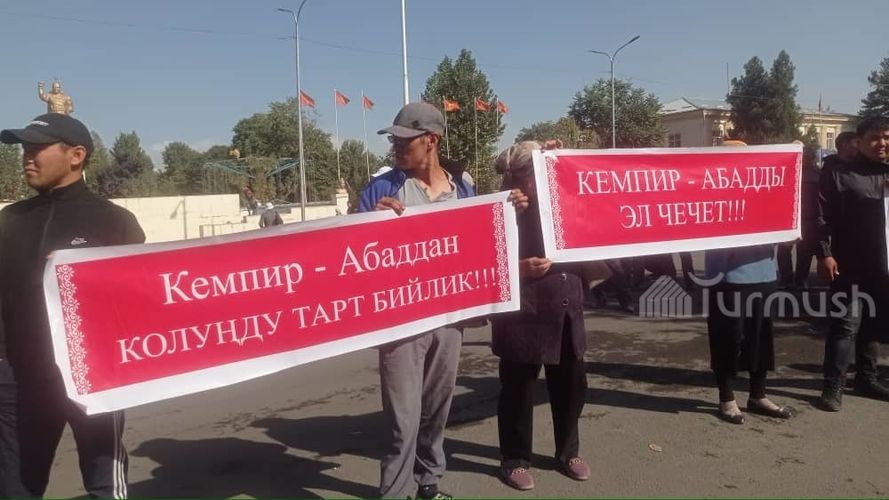 Journalists also report that many residents were not allowed to participate in the meeting. According to them, only specially trained people were allowed to enter the building. They gathered near the district administration building and hold slogans: «Authorities, hands off Kempir-Abad!», «People will make a decision on Kempir-Abad issue!», «It is better to give life than land!» and «Cancel protocols».