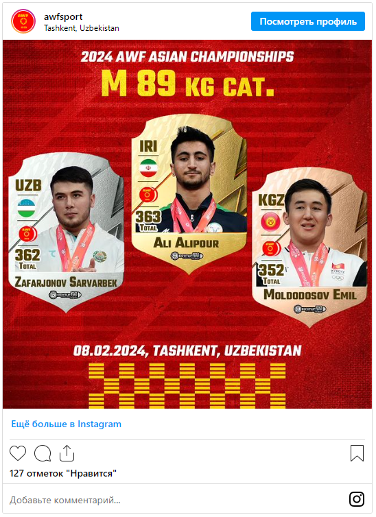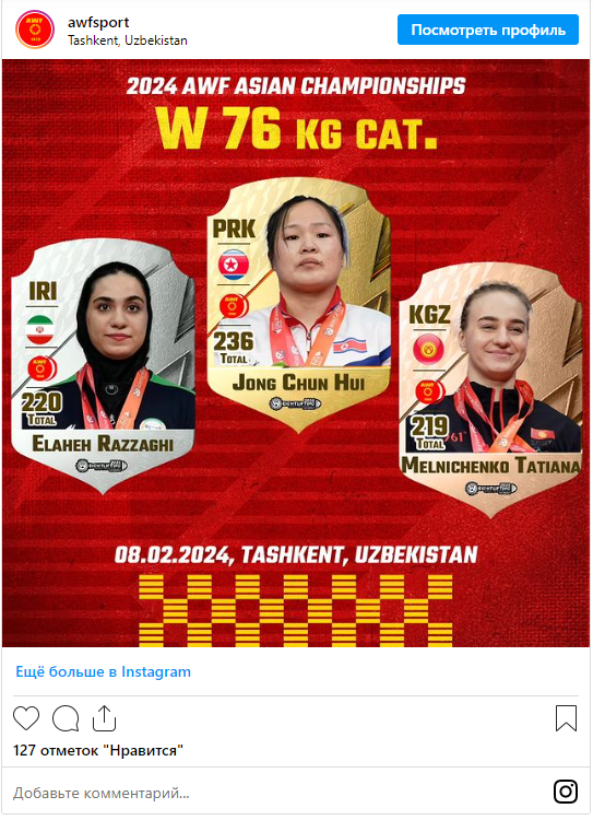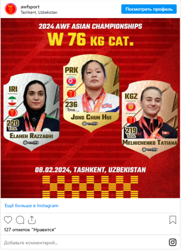 Tatyana Melnichenko (up to 76 kilograms) also finished third. Her result is 219 kilograms. Five athletes represent Kyrgyzstan at the championships. They will also be able to gain ranking points on their way to the Olympics in Paris.
