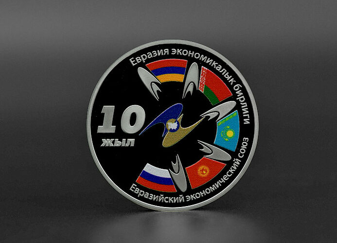 The main theme of the front side of the coin is the official emblem of the EAEU, around which there are images of the flags of the EAEU member countries, as well as elements of the EAEU emblem, symbolizing dynamics and development. The anniversary date of the EAEU «10 years» is on the left side of the coin. On the circumference of the coin there is the inscription «Eurasia ekonomikalyk birligi / Eurasian Economic Union».