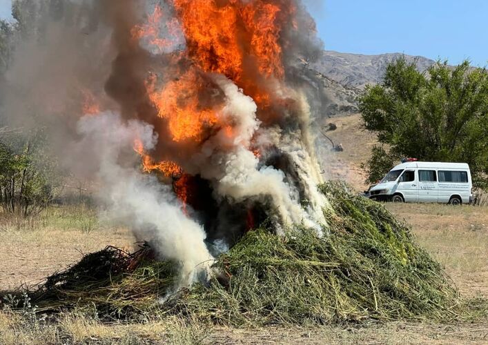 Law enforcement officers burned almost one ton of wild hemp in Bakai-Ata district. The press service of the Internal Affairs Department of Talas region informed 24-kg.com news agency.
