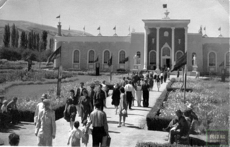 The VDNKh of the Kirghiz SSR was established in 1947 to showcase the main achievements of industry, agriculture, transport and science, as well as the cultural lifestyle of the republic. In 1956, the livestock exhibition was renamed into VDNKh. It occupied an area of 110 hectares, of which just over 30 hectares were allocated for primary use, the remaining space was occupied by vineyards and orchards of fruit trees. There was also an arboretum, which had about 60 species of trees and shrubs. Among them were various species of spruce, pine, juniper, biota, thuja, birch, rowan, oleaster, rose, sycamore and others. More than 20 species of flowers were grown on the territory of the exhibition.