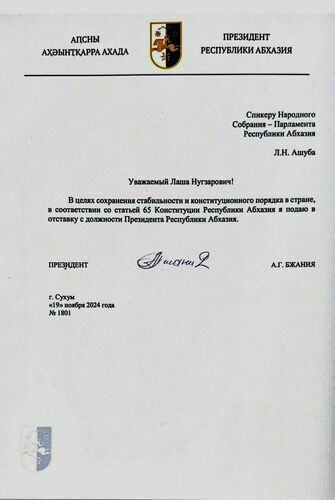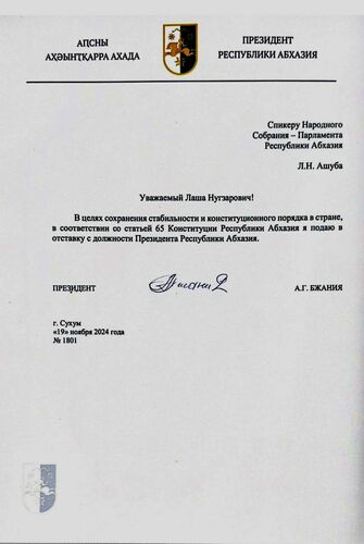 The President of Abkhazia Aslan Bzhania is resigning. Interfax reported, citing the protocol signed following the negotiations between the opposition and the authorities.