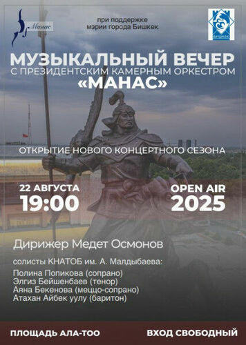 Maestro Medet Osmonov will be conducting this evening. Soloists of the Kyrgyz National Academic Opera and Ballet Theater named after Maldybaev will perform with the orchestra: Polina Popikova, Elgiz Beishenbaev, Ayana Bekenova, Atakhan Aibek uulu.The City Hall invites all residents and guests of the capital to join the evenings and enjoy live music in the open air.