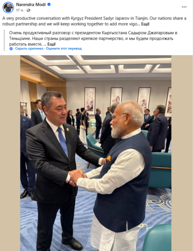 «A very productive conversation with Kyrgyz President Sadyr Japarov in Tianjin. Our nations share a robust partnership and we will keep working together to add more vigour to our developmental cooperation,» Modi wrote on his official social media account, posting a photo from the meeting.
