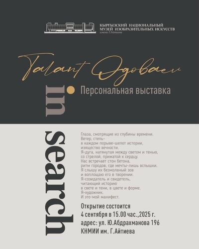 A personal exhibition of Talant Ogobaev In Search will open on September 4 at the Kyrgyz National Museum of Fine Arts named after Gapar Aitiev. The Kyrgyz National Museum of Fine Arts reported.