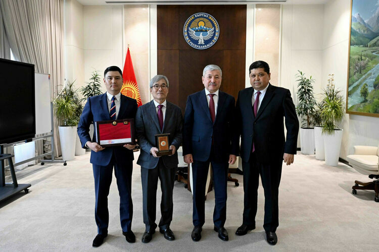 Chairman of the Cabinet of Ministers Adylbek Kasymaliev presented the Dank Order to Chung Jin-bok, President of the South Korean company Miru Systems, and a Certificate of Honor to Tilek Shygai, the company’s representative in Kyrgyzstan.