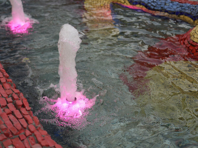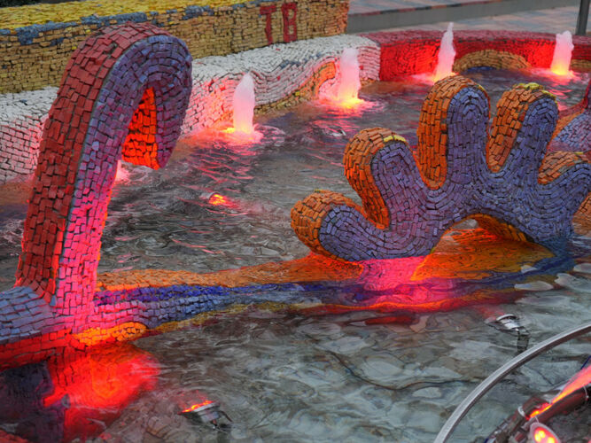 The repair included a full range of dismantling and restoration works. The fountain’s surface was cleaned with sandblasting; the old water supply system, excess concrete layer above the mosaic, outdated pavement, and lighting were all removed.