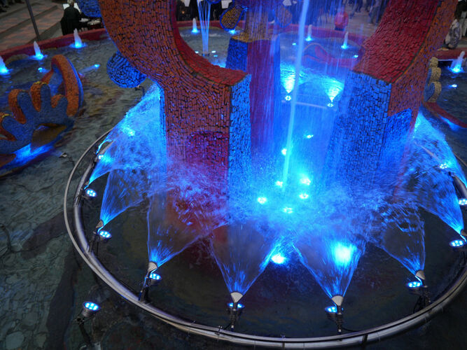 Waterproofing of the fountain basin was also carried out: the surface was cleaned, seams and cracks were sealed, and a multilayer varnish was applied to enhance color and restore the fountain’s original shine. The pumping and electrical systems were completely replaced, and a new control room and a switching channel connecting it to the fountain were installed.