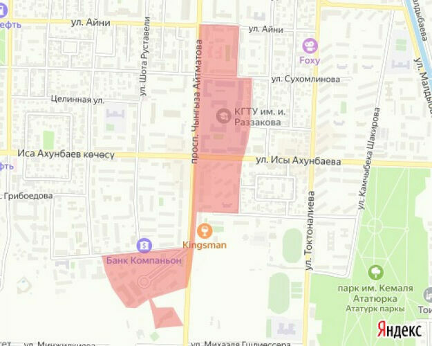 - Chingiz Aitmatov Avenue, Aini, Vodoprovodnaya, Sukhomlinov, Tselinnaya, Politekhnicheskaya, and Tash-Kumyrskaya Streets;