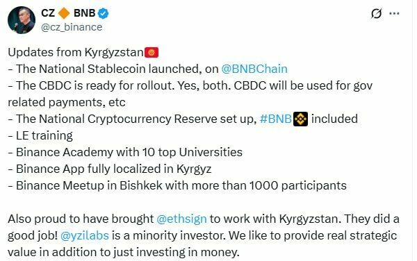 A national stablecoin has been launched in Kyrgyzstan. Binance founder Changpeng Zhao announced on his X account. He added that the digital som is ready for implementation.