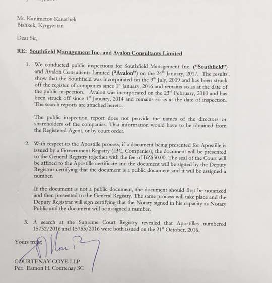OTRK (Public Radio and Television Corporation of Kyrgyzstan) received documents from Belize on offshore companies Southfield and Avalon. They are identical to the data obtained at the request of deputies from Ata Meken faction.