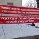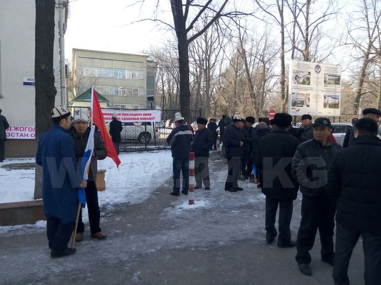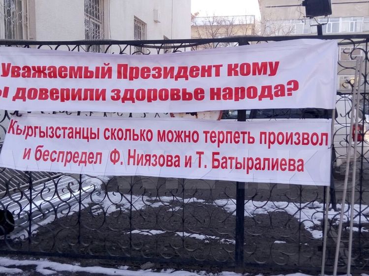 More than 20 protesters gathered in front of the building, they are holding posters with slogans «Dear President, whom have you entrusted health of the people?», «Kyrgyzstanis, how long can we tolerate arbitrariness of Farid Niyazov and Talantbek Batyraliev» and others.