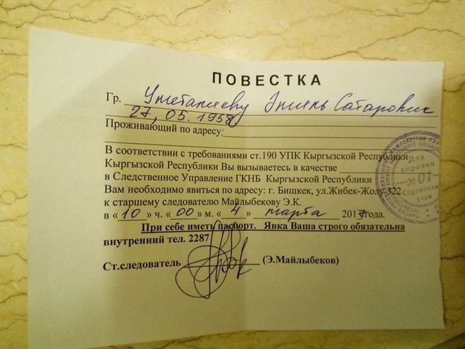 Note, the agenda doesn’t indicate the case on which Umbetaliev is summoned. He must come for questioning to the senior investigator Maylybekov at 10.00 am.