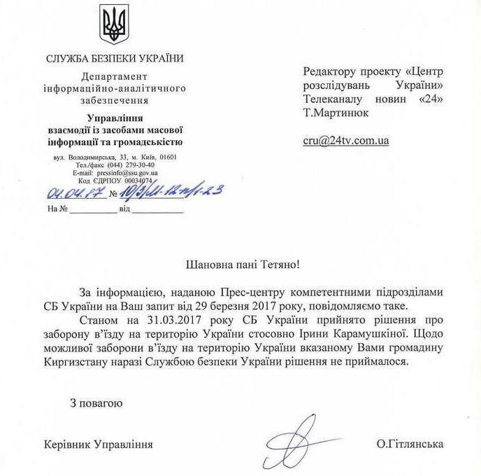Ilya Lukash added that the Security Service of Ukraine was considering the issue of banning the entry into the territory of Ukraine for the deputy of Kyrgyz Parliament Marat Amankulov, who was in the Crimea together with Irina Karamushkina.