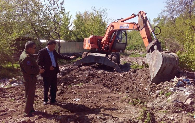 The head of the Pervomaisky district administration Askerbek Aliyev together with the head of the District Department of the Ministry of Emergency Situations S. Chonoev got acquainted with the progress of the shore protection works in Ala-Archa riverbed and the work on padding the roads in Zavodskoy settlement.