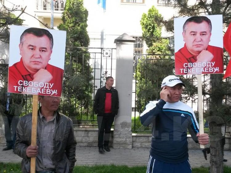 There are about 30–40 of them now. There are lawyers of the politician, public figures Asiya Sasykbaeva and Tursunbek Akun among them. They have flags of Ata Meken and posters with the inscription «Freedom to Tekebayev.»