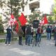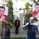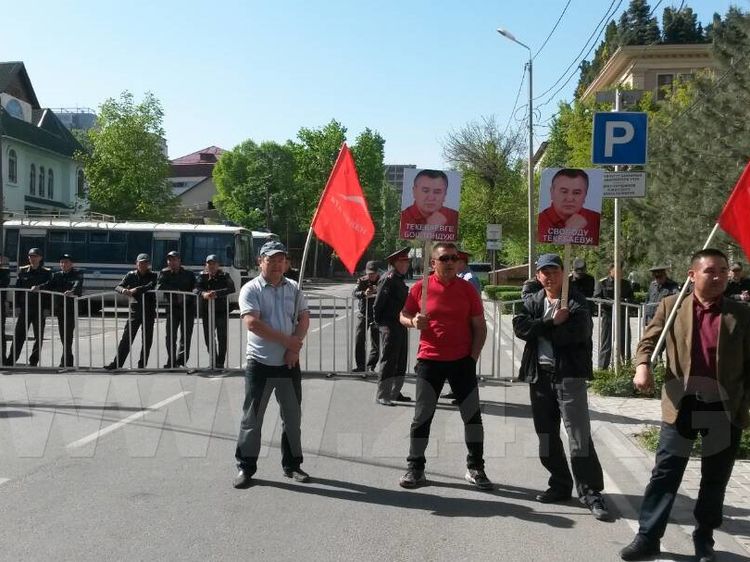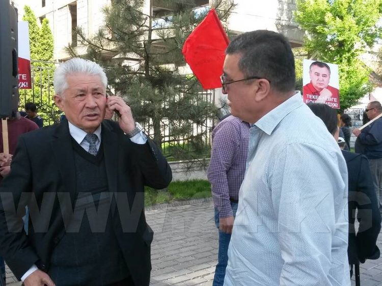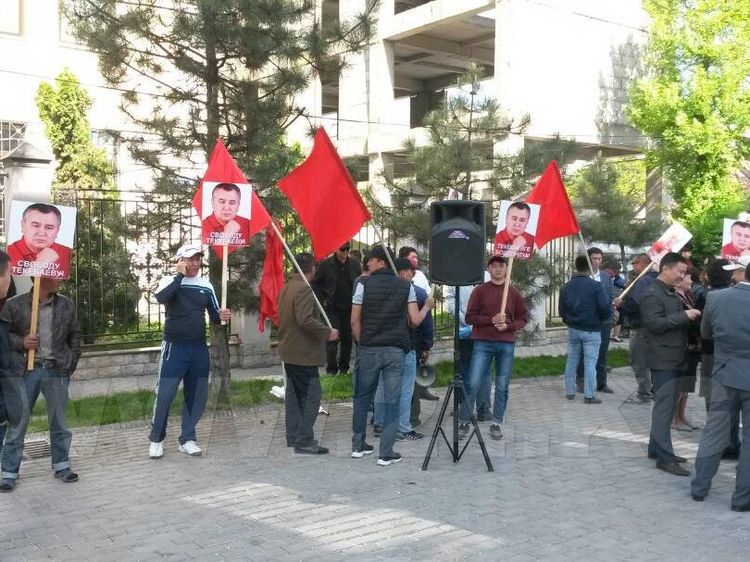 Supporters of the leader of Ata Meken party, deputy of Parliament Omurbek Tekebayev gather near the Bishkek City Court building.
