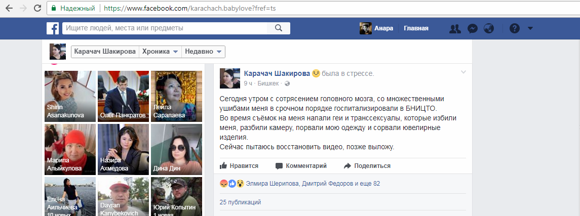 Kyrgyz journalist Karachach Shakirova was beaten up by gay men and transsexuals. She posted on Facebook.