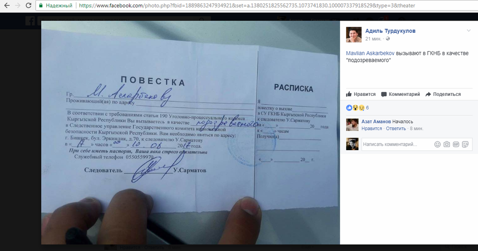Civil activist Mavlyan Askarbekov was summoned for questioning to the State Committee for National Security as a suspect. Civil activist Adil Turdukulov said on Facebook.