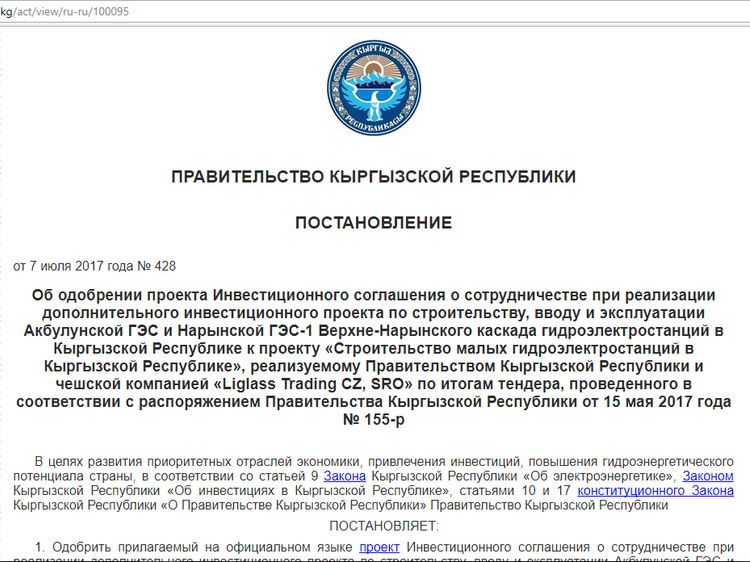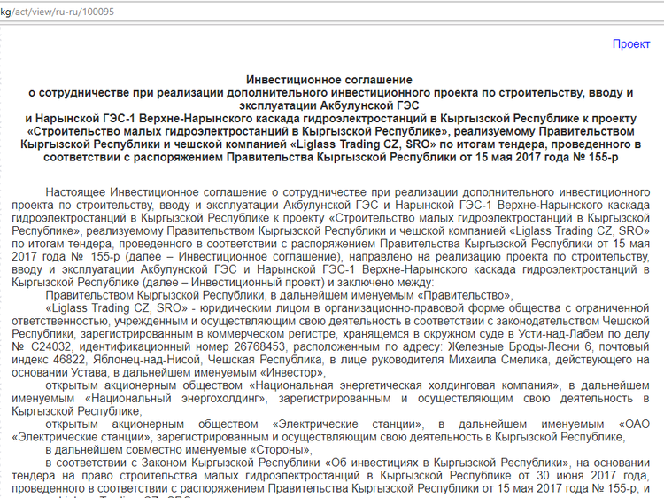 However, recently, the Ministry of Justice posted on its website a government decree on the contract with Liglass Trading. There is also an investment agreement in it. This document states that 25 percent of the total contract amount is a free-of-charge contribution of Liglass Trading to the construction project of the Upper Naryn cascade of HPPs. At the same time, the first $ 37 millions of this amount are to be transferred within 30 banking days after the signing of the agreement. And the Czech company is to transfer the rest of the sum after the approval of the transaction on transfer of 50 percent of the shares of Upper Naryn HPP CJSC to Liglass Trading.