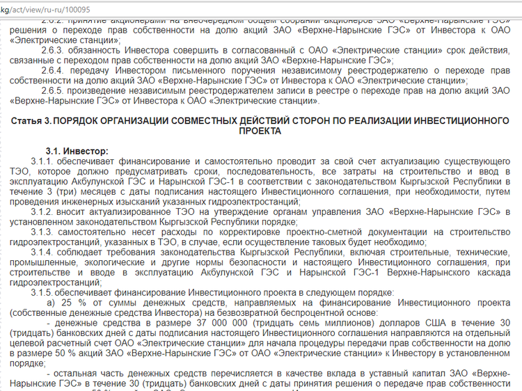Not everything is clear with the date too. When the parties only signed the agreement, it was publicly announced that Liglass Trading would transfer $ 37 million within 30 days to buy 50 percent of the shares in Upper Naryn CJSC. This is exactly the amount that Kyrgyzstan should return to the Russian company RusHydro, which is already preparing to file a suit to international arbitration against us.