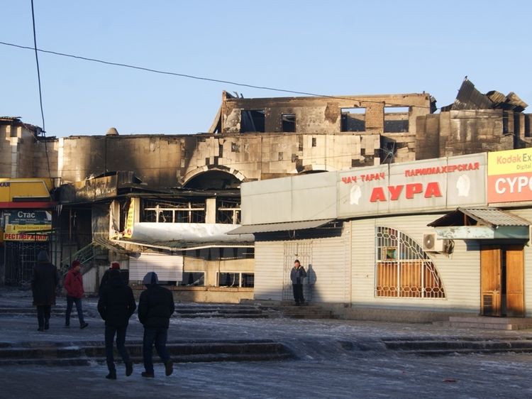 But it seems a lot could be saved in the pavilions installed around this building. Undamaged dummies, jackets, skirts are lying in the piles of garbage. Yesterday, the owners of these pavilions tried to break through the cordon to pull something out of the fire. They shouted, cried, said that they had big loans.