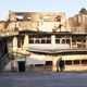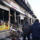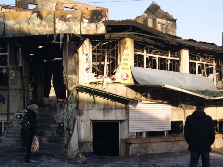 Curious sellers, whose trade places were not damaged by the fire, are walking around the ruins. Before start of the working day, people came to look at the ruins of the burnt down building and pavilions.