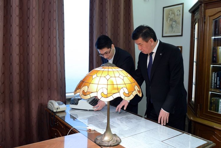 The wife of the writer Maria Aitmatova and son Eldar Aitmatov showed the head of state the museum of the people’s writer of Kyrgyzstan, his manuscripts. The relatives of the writer told about work on museum development, eternalizing the Aitmatov’s memory.