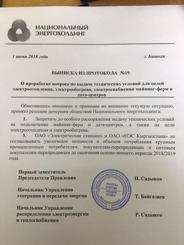 The issue of technical specifications for connection of mining farms and data centers was submitted for consideration to the State Committee of Energy, Industry and Subsoil Use of the Kyrgyz Republic. The requested power capacity of mining farms is high and is about 300 MW, this is consumption of one city.
