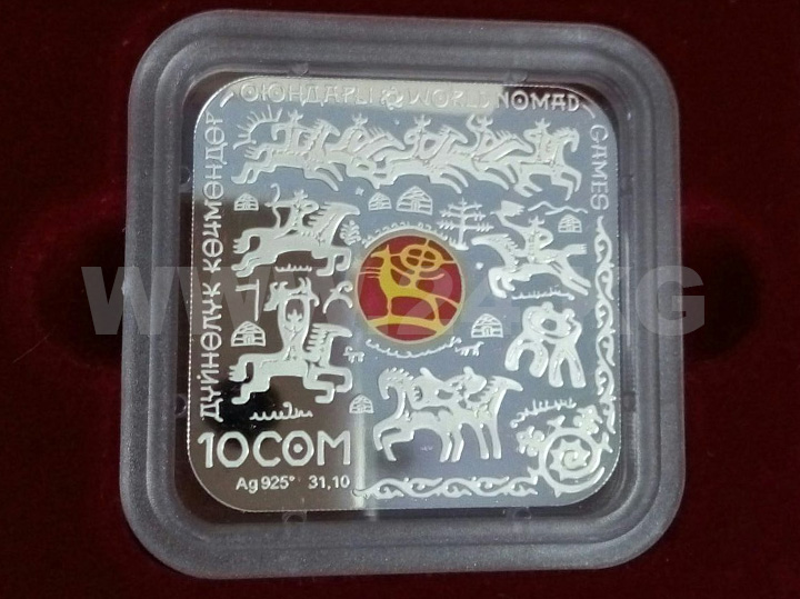 Основным сюжетом лицевой стороны монеты «Всемирные игры кочевников» (также номиналом 10 сомов) являются иллюстрированные изображения кочевников, участвующих в различных играх и состязаниях. В центре размещен логотип игр, выполненный тампонной печатью. Вес монеты - 31,1 грамма. На оборотной стороне в центре представлены герб КР и стилизованное изображение дома кочевника – юрты. В нижней части указан год выпуска - 2016. «Это первая квадратная монета, выпущенная за 25 лет. Монеты квадратной и овальной форм набирают популярность. Нацбанк учел это», - заметил начальник управления денежной наличности НБ КР Шамиль Айдаркулов.