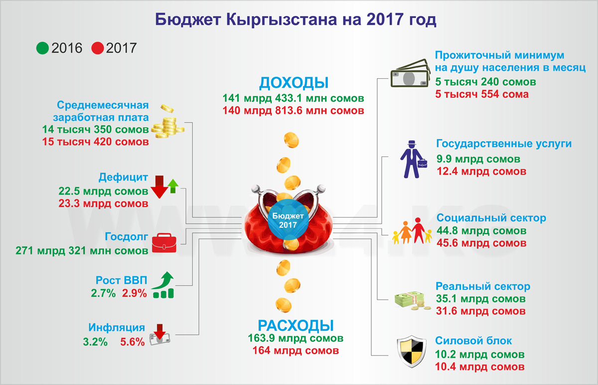 Так, доходы незначительно сократятся по сравнению с прошлым годом и составят 140 миллиардов 813,6 миллиона сомов. В то же время расходы вырастут со 163,9 миллиарда сомов до 164 миллиардов сомов.