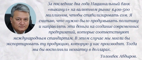 «Если посмотреть на ситуацию в стране, то видно, что многие предприятия простаивают. На экспорт уходит мало продукции. В прошлом году мы вступили в ЕАЭС, где действуют достаточно сложные технические регламенты. Получается, что эти правила не дают широко развернуться и экспортировать продукцию в страны союза. Сегодня предприятия пытаются адаптироваться к новым условиям, соответствовать техрегламентам, но на это тоже нужно время. И это одна из причин, почему доллары сегодня не востребованы для покупки сырья. Поэтому курс доллара и держится на уровне 68-69 сомов», - говорит Толонбек Абдыров.