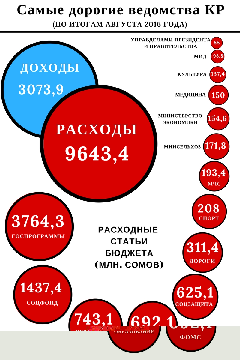 Самые большие затраты на зарплату у Министерства образования и науки – 440,1 миллиона сомов. А вот на выплату заработной платы сотрудникам Жогорку Кенеша, в том числе депутатам, и врачам потратили одинаково – по 42,6 миллиона сомов.