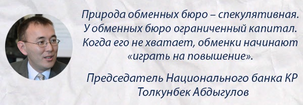 Например, в 2015 году Национальный банк временно снизил минимальные требования к размеру оборотных средств с 1 миллиона до 500 тысяч сомов. В июле 2016-го постановлением правления НБ КР отменили до конца года требования по предоставлению подтверждающих документов о происхождении оборотных средств.