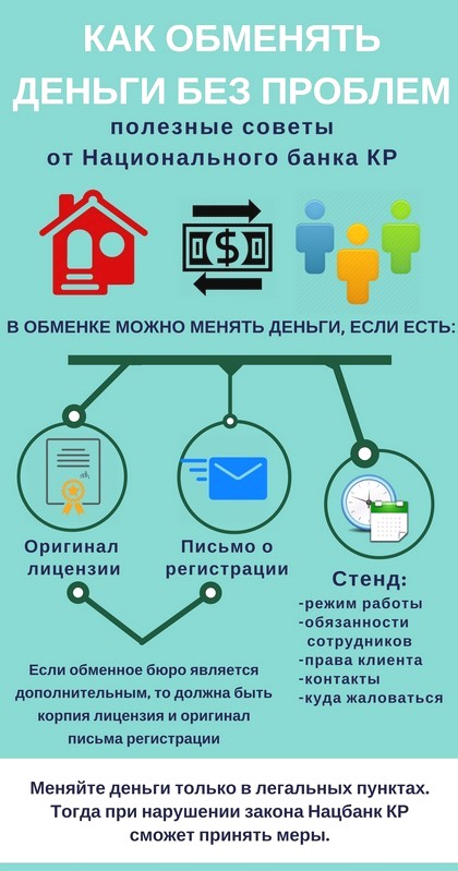 При этом в Национальном банке отмечают, что не собираются устраивать гонения. Даже у «теневых» обменок есть шанс войти в правовое поле без скандалов и проблем. Надо лишь обратиться с необходимыми документами в НБ КР для получения лицензии. Она позволяет законно осуществлять операции с иностранной валютой.