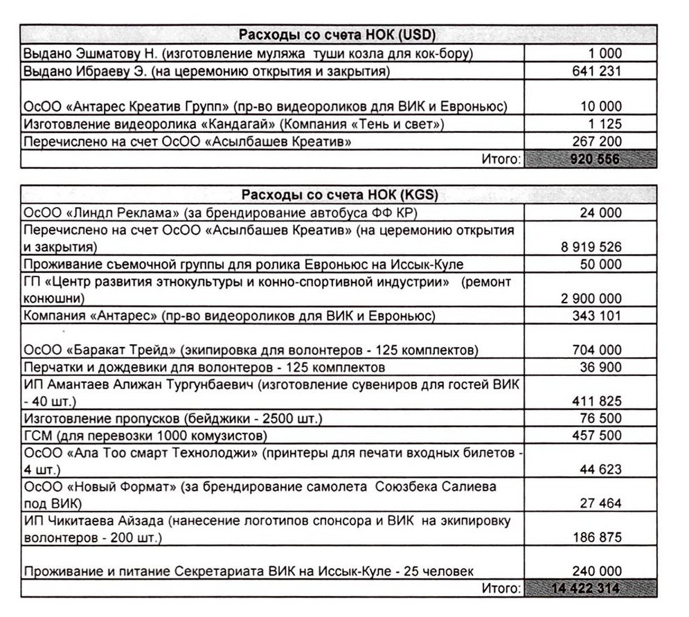 Из спонсорских средств большего всего выделили ОсОО «Альянс алтын» ($200 тысяч), частные предприниматели ($100 тысяч) и ОсОО «Сити-центр» (14 миллионов сомов).