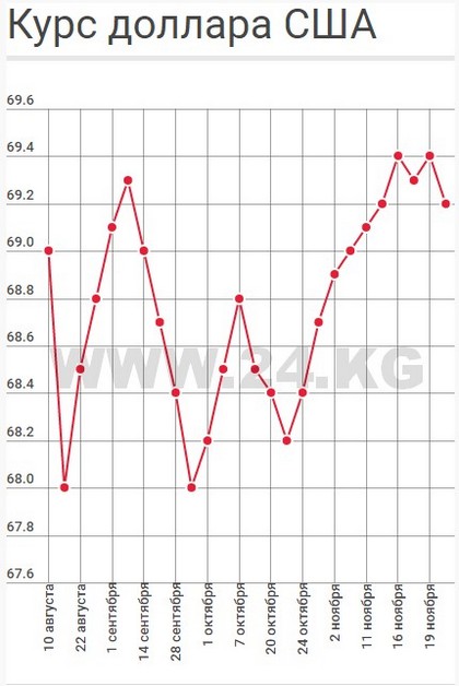 Сегодня обменные пункты столицы и коммерческие банки покупают доллар по 69-69,1 сома, продают по 69,2. Номинальный курс - 69,1238 сома (падение за сутки – 0,1 процента).