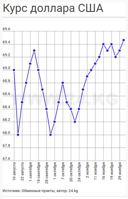 Сегодня обменные пункты столицы и коммерческие банки покупают доллар по 69-69,3 сома, а продают по 69,4-69,46. Примерно на той же отметке он находился в середине ноября.