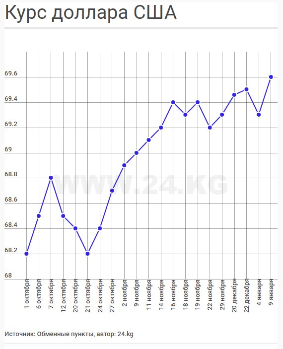 Сегодня обменные пункты столицы покупают доллар по 69,2-69,3 сома, а продают по 69,5-69,6 сома. Номинальный курс - 69,2133 сома (рост за сутки на 0,263 процента).