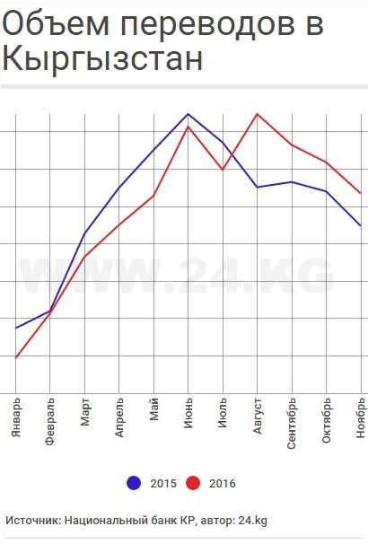Больше всего денег в Кыргызстан поступает из России: в ноябре 2016 года - $171,1 миллиона. Поступления выросли на 37,3 процента.