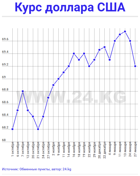 Сегодня обменные пункты столицы покупают доллар по 68,8-69 сомов, а продают по 69,2.