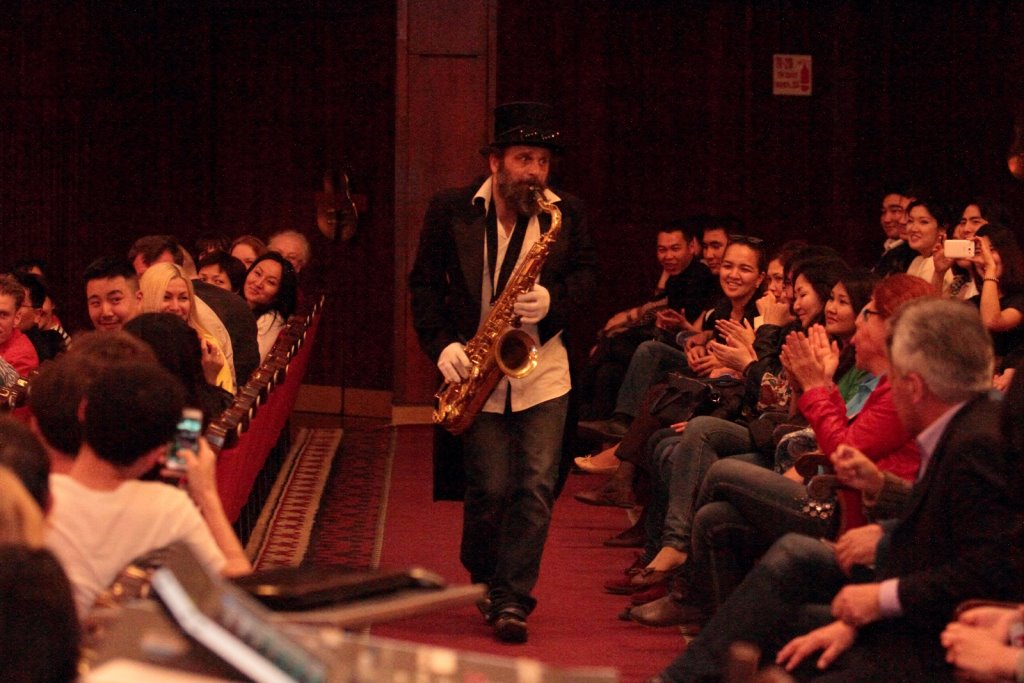 Дальше зазвучал остроумный расслабленный ска, немного свинга. Интонации, отдаленно напоминающие Тома Уэйтса. Взгляд исподлобья. Ехидная улыбка. Темные костюмы и смешная шерстяная шапка солиста... Австрийцы из The Merry Poppins встряхнули загрустившую публику. Они не играют джаз, но уже второй раз приезжают на фестиваль. Почему? Потому что это одна из лучших клубных команд Европы. Хулиганская смесь свинга, рок-н-ролла и уличного ска — то, чего так не хватает на многих концертах. И я не считаю их приезд в Бишкек ошибкой организаторов. Почему бы и нет?